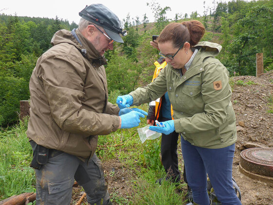 Nach der Rettungsaktion wurden durch Jasmin Mantilla und Michael Frede (Biologische Station) von den Tieren noch kurz Hautabstriche genommen, um festzustellen, ob diese Träger der tödlichen Salamanderpest (Bsal) sind.